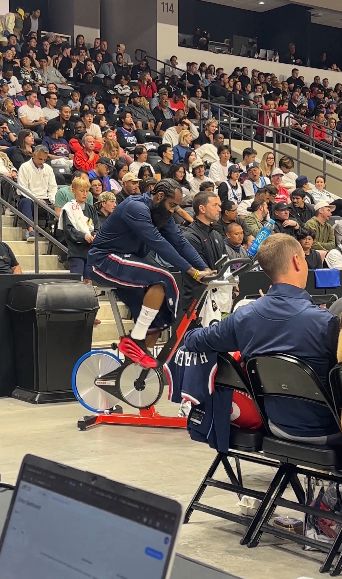 美媒曬出視頻,比賽期間哈登在場(chǎng)邊進(jìn)行完整的單車訓(xùn)練。